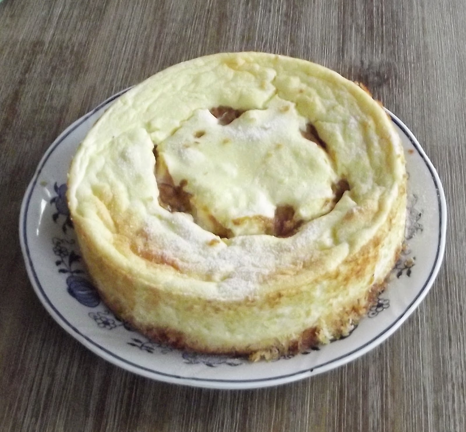 Brzoskwinię ze skórką, ale bez pestki rozdrobnić w malakserze i wymieszać z kardamonem. Nakładać łyżeczką kleksy na masę serową . Piec w piekarniku nagrzanym do 160*C przez ok. 80 min.