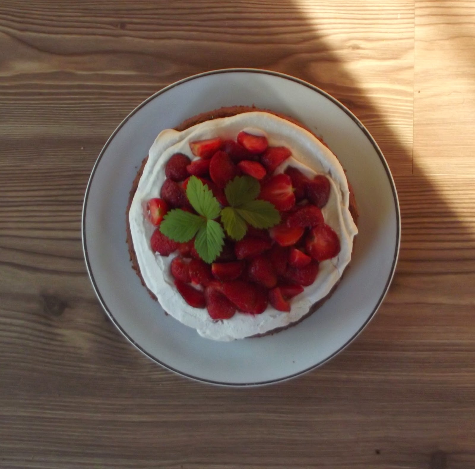 Kakaowe ciasto biszkoptowe z kremem z mleka kokosowego z truskawkami