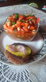 Gulasz to podsmażona cebulka, pieczarki, kapusta pekińska, pomidory, papryka i ciecierzyca. Całość doprawiona solą, pieprze, papryką wędzoną i czerwoną czubrycą. Mniam. Na początek dnia polecam, dzień nawet deszczowy wydaje się jakby był słoneczny.