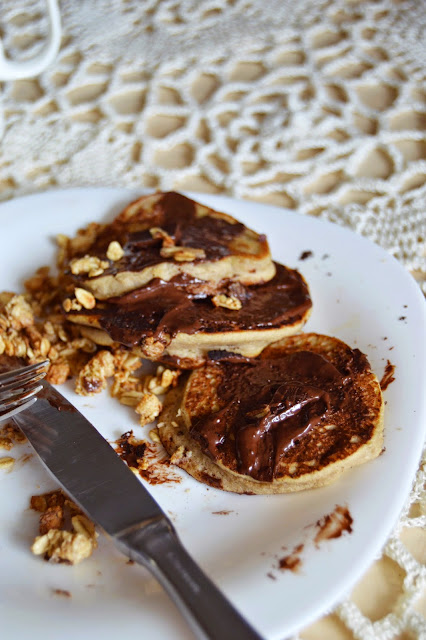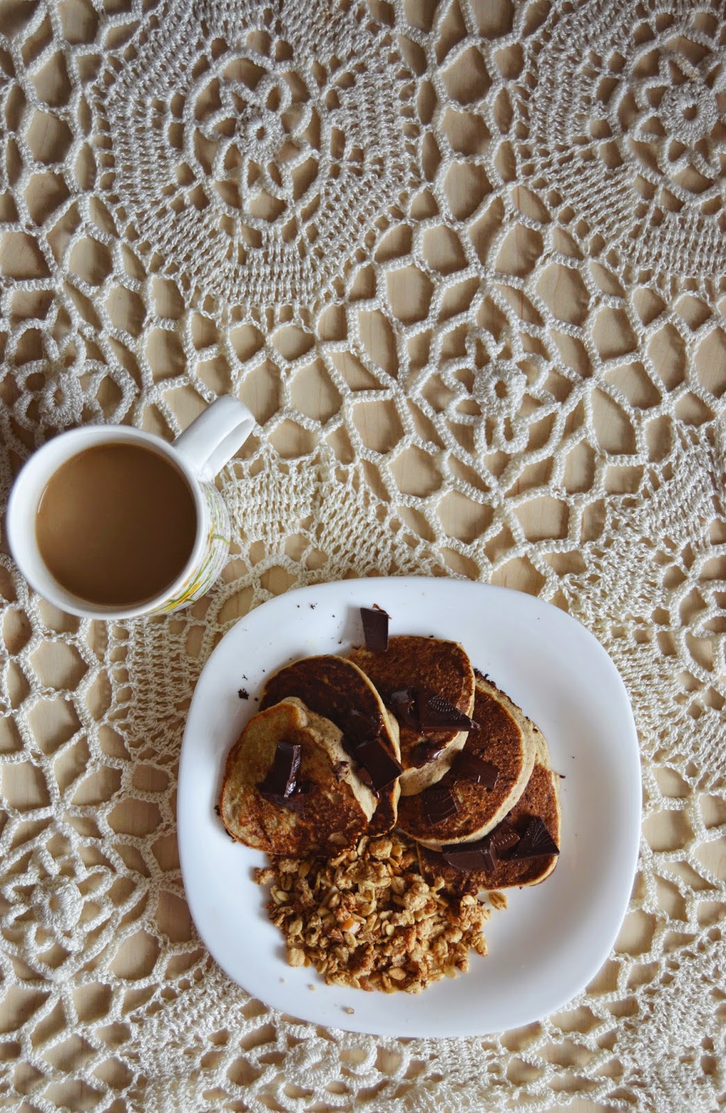 Trzyskładnikowe* placki bananowe podane z czekoladą kawową i musli *2 banany, jajko, łyżka mąki kukurydzianej |