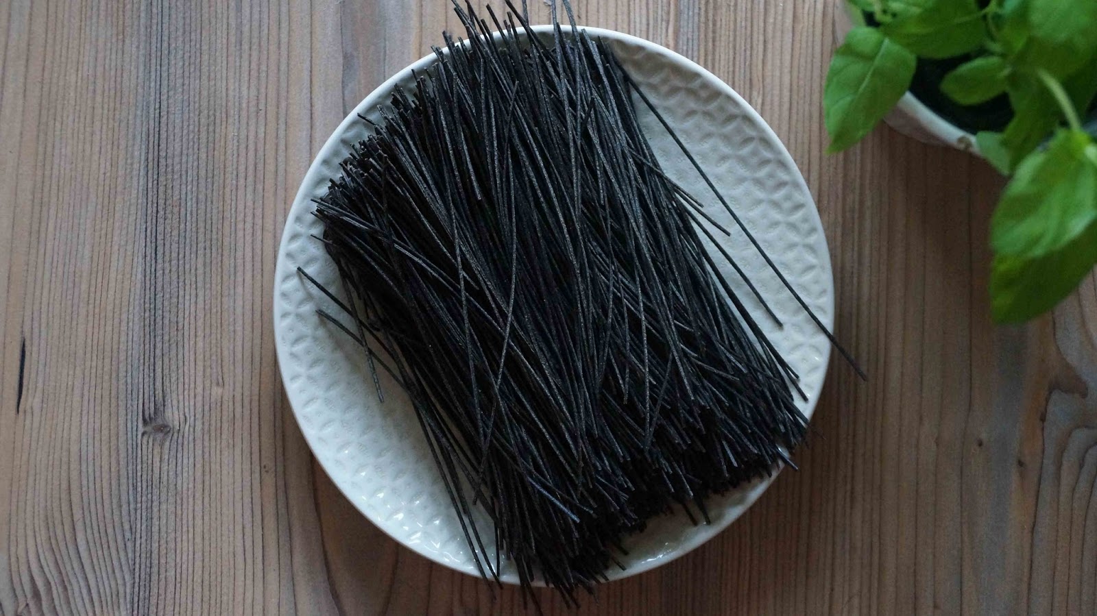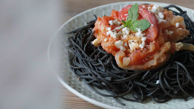 Ostatnio mniej gotuje bo przy tych temperaturach w mieszkaniu da się zrobić najwyżej sałatkę :) a i tak nikt nie jest za bardzo głodny ;) Dzisiaj jednak za sprawą koszmaru wstałam o 4 i przyjemna temperatura powietrza wpadającego przez otwarte okno zachęciła mnie do ugotowania makaronu, który ostatnio udało mi się kupić. Nawet nie wiedziałam że z soi robi się makaron i to jeszcze z czarnej ;) Wygląda jak z kałamarnicy, bardzo szybko się gotuje - 3 minuty, zupełnie się nie skleja, jest sprężysty i bardzo smaczny. A zalet zdrowotnych co niemiara - niski indeks glikemiczny, bezglutenowość i dużo błonnika. Szkoda, że tak trudny do dostania w sklepach ale naprawdę warto poszukać! W moim wydaniu z sosem pomidorowym z kozią fetą ale myślę, że będzie pasował nawet do rosołu :)