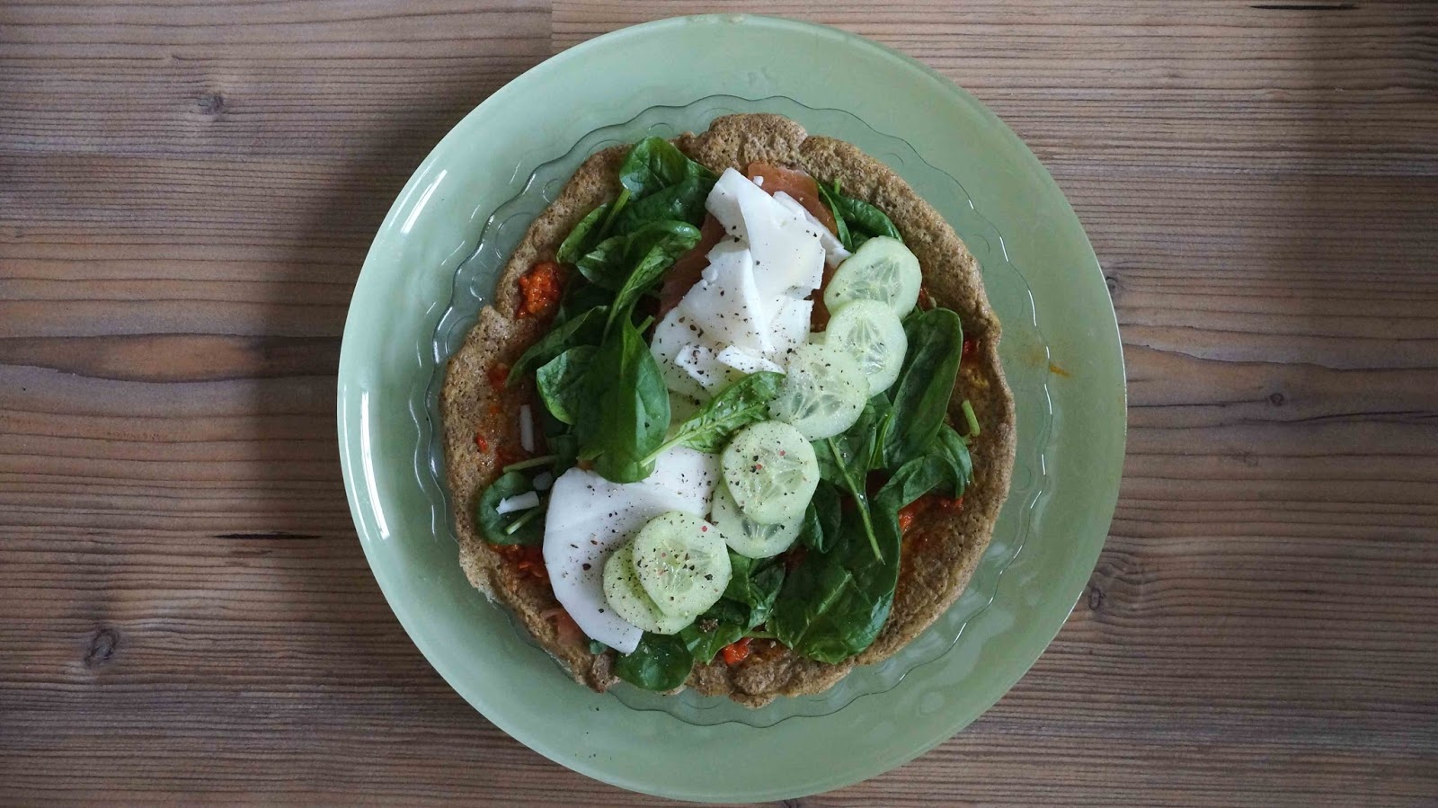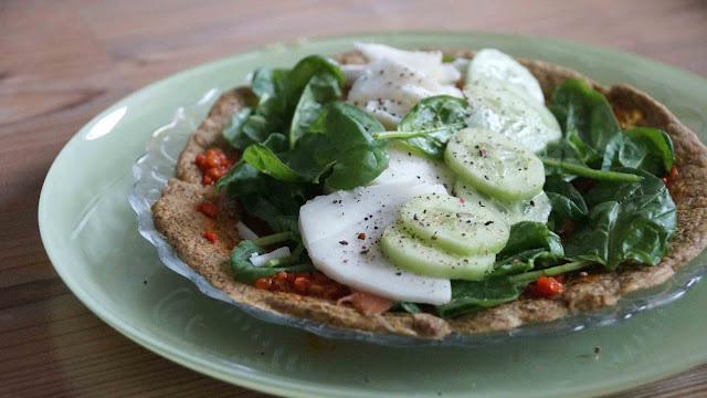 Połączyć składniki mokre, dodać suche i wszystko wymieszać. Smażyć jak naleśniki na delikatnie natłuszczonej patelni i można podawać z dowolnymi składnikami (u mnie ser kozi, szpinak, ogórki i pesto paprykowe).