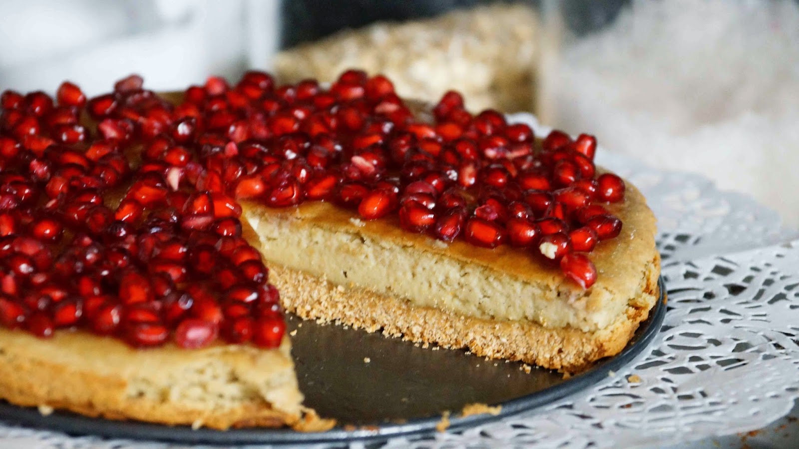 W ramach planu bikini wykluczyłam nabiał, poza odrobiną koziego sera, więc miałam motywację do zrobienia sernika zupełnie roślinnego. Przepis powstał jako miks sernika z tofu i sernika orzechowego - z tofu, mleka sojowego i słonecznika, ale myślę, że można go zastąpić dowolnymi orzechami. Masa wyszła kremowa - waniliowo - cytrynowa a wierzch posypałam granatem. Pierwszy eksperyment z sernikiem roślinnym okazał się całkiem udany :) Wydaje mi się, że warto tylko zrobić spód z połowy porcji lub podwoić porcję składników na masę, bo w moim wydaniu spód wyszedł prawie tak gruby jak masa :) albo najlepiej z niego w ogóle zrezygnować :) ?!
