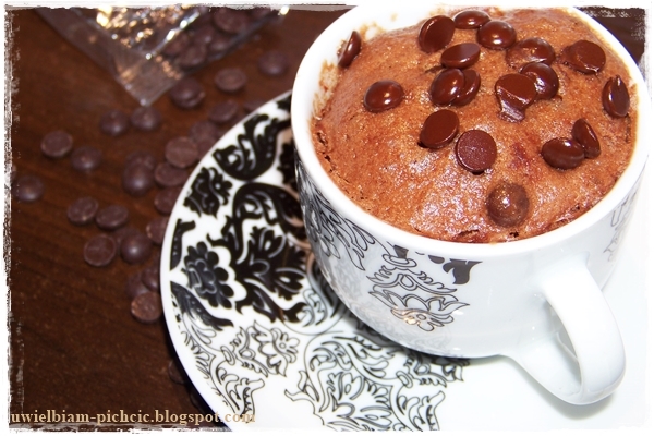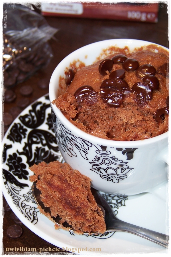 Wiele wypróbowałam przepisów na ciacho z mikrofali. Albo były za suche, albo wręcz "wypływały" z kubka lub też były najzwyczajniej niesmaczne. Po wielu modyfikacjach doszłam do perfekcji. Kto lubi ciasta wilgotne, ciężkie i mocno czekoladowe temu sposoba się mój przepis na ten szybki deser. Z podanej porcji wychodzą około dwie filiżanki w zależności od pojemności.