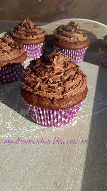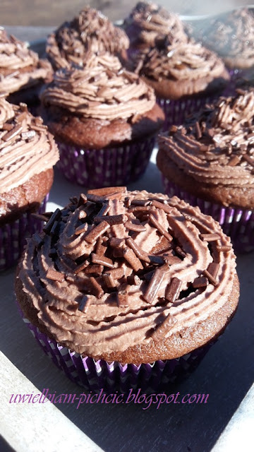 Muffiny mojego autorstwa, które przygotawałam na moje dzisiejsze urodziny zamiast torta. Uwielbiam czekoladę w każdej postaci dlatego musiałobyć to coś baaaaaardzo czekoladowego. Muffinki są pyszne, wilgotne i mięciutkie. Ta wersja jest z nadzieniem z nutelli ale następnym razem warto zrobić z kawałkami czekolady :)-1,5 szklanki mąki