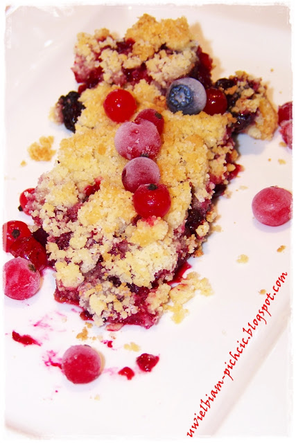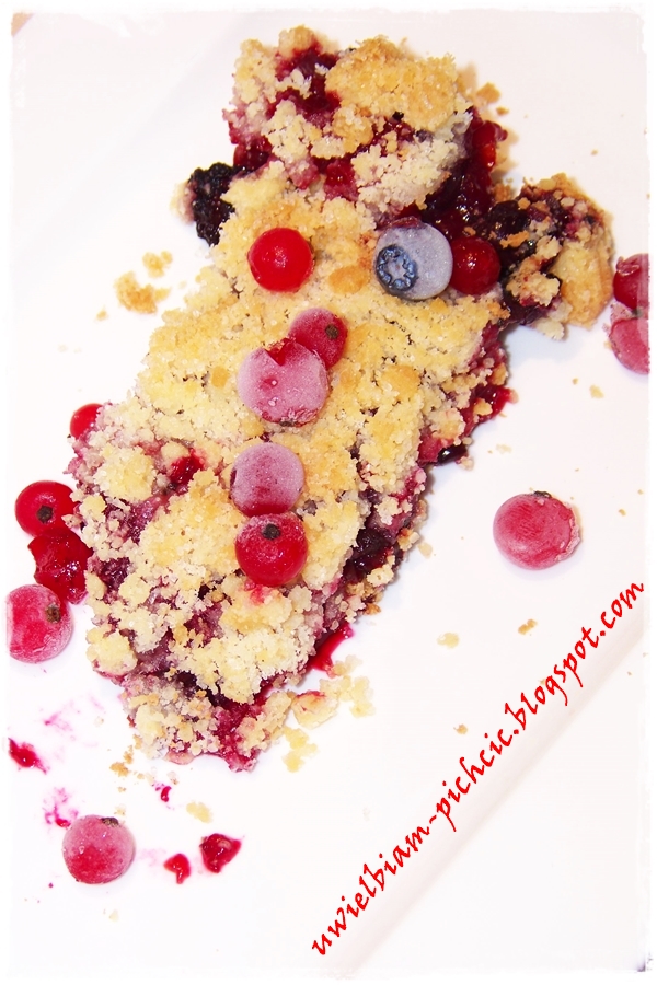 Całkiem spontanicznie wyszedł mi dzisiaj ten deser, a takie są zawsze najlepsze. A ponieważ mam pełną zamrażarkę mrożonych owoców które zbierałam latem, postanowiłam, że ich użyję dziś. I tak wyszło mi crumble z jeżynami, czerwonymi i czarnymi porzeczkami oraz borówkami amerykańskimi. Najlepsze są właśnie kwaskowe owoce. Ale ten deser można robić również z truskawkami, śliwkami, jabłkami i innymi. Najlepiej smakuje ciepły lub nawet gorący. Polecam.