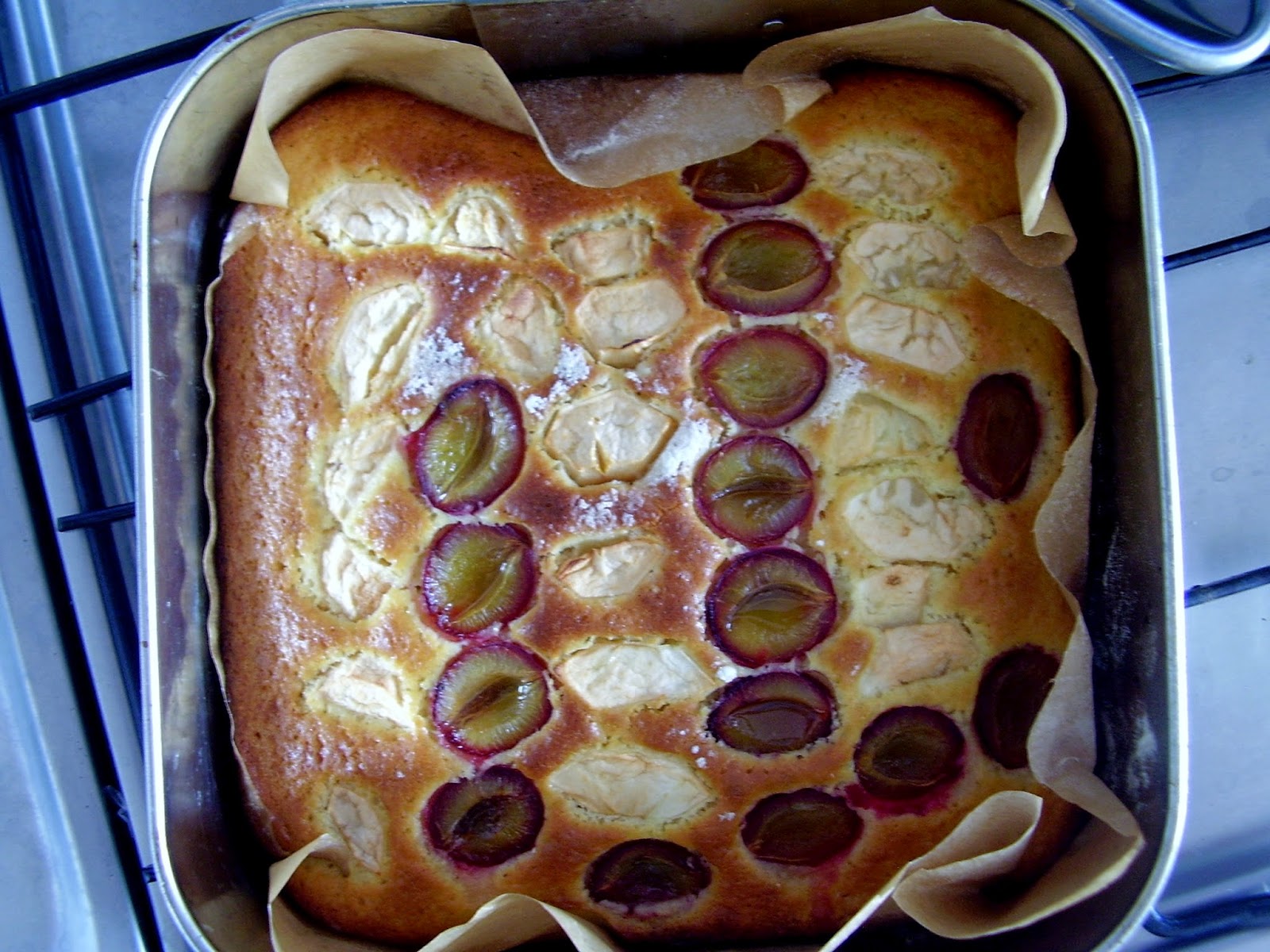 Blaszkę 20x20 posmarować masłem i wyłożyć papierem do pieczenia. Wszystkie składniki wymieszać, krótko, tylko do połączenia. Wlać do blaszki, lekko posypać mąką(żeby owoce nie opadły na dno) i ułożyć kawałki owoców. Piec ok.35 minut w 160 stopniach.