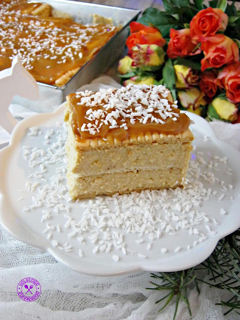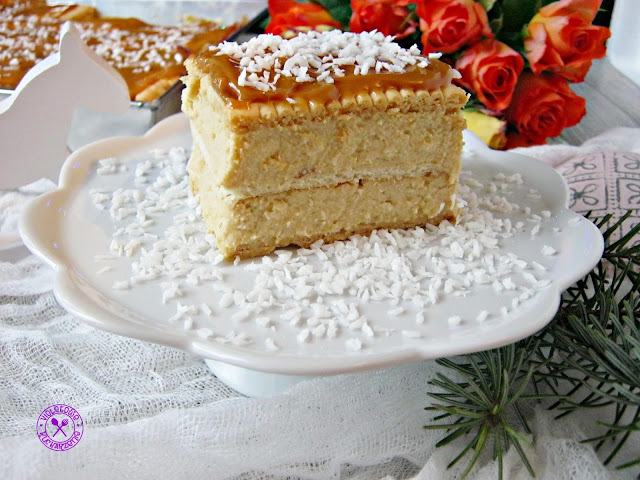 Foremkę wykładamy papierem do pieczenia. Na dnie wykładamy pierwszą warstwę herbatników, wylewamy połowę masy serowej, wygładzamy. Następnie wykładamy kolejną warstwę masy i kolejną warstwę herbatników. Na wierzchu rozsmarowujemy kajmak i rozsypujemy wiórki kokosowe. Odstawiamy do wystudzenia. Po ostygnięciu wstawiamy do lodówki.