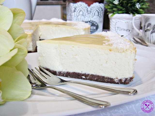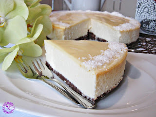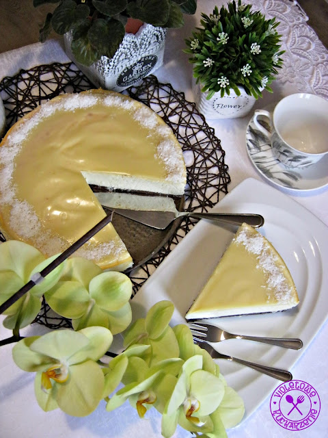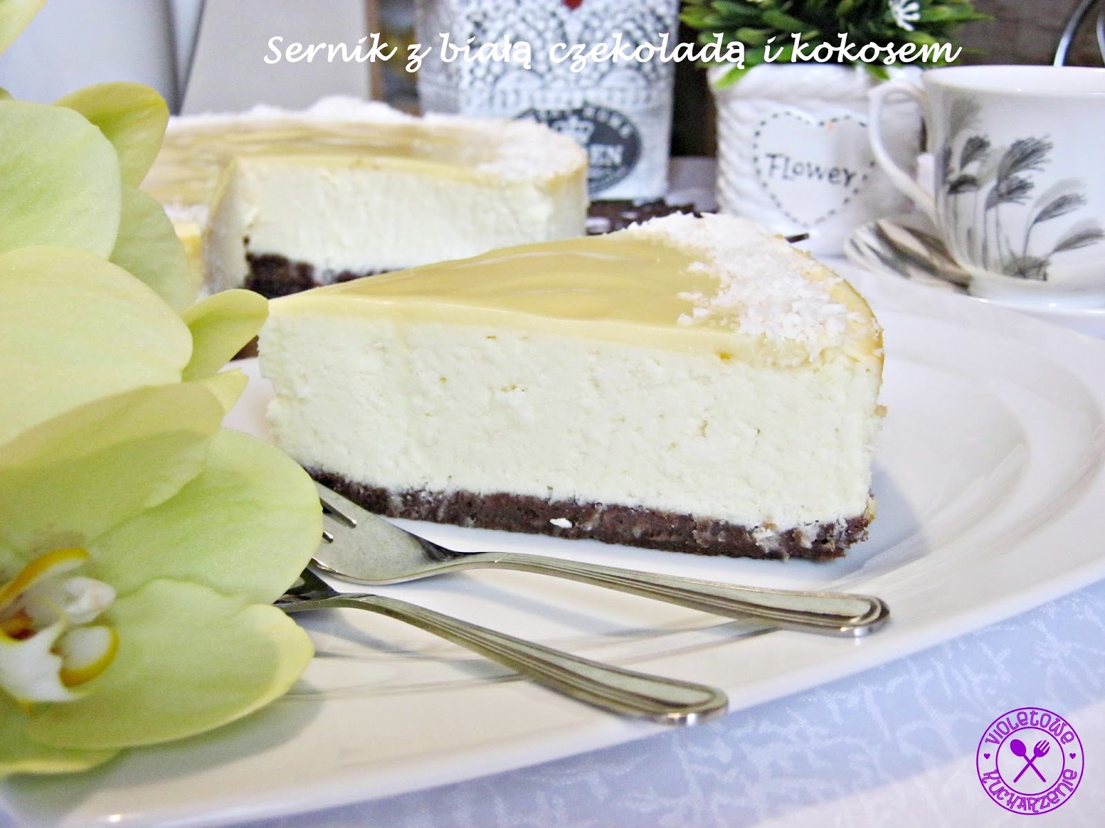Piekarnik nastawiamy na temperaturę 180*C (bez termo obiegu). Białą czekoladę rozpuszczamy w kąpieli wodnej, studzimy. Do misy miksera wykładamy ser z wiaderka, dosypujemy cukier i miksujemy do połączenia składników. Następnie wsypujemy mleko w proszku oraz mąkę ziemniaczaną. Kolejno wbijamy po jednym jajku i czekamy aż połączą się z masą. Wyłączamy mikser. Do rozpuszczonej i lekko przestudzonej czekolady wlewamy 4 łyżki masy serowej, energicznie mieszamy trzepaczka aby czekolada się nie zważyła. Zahartowana czekoladę przelewamy do masy serowej, delikatnie miksujemy. Wlewamy śmietanę kremówkę oraz wsypujemy wiórki kokosowe. Gotową masę serową przelewamy na spód. Piekarnik zmniejszamy do temperatury 120*C (bez termo obiegu). Na dnie piekarnika ustawiamy foremkę z wrzątkiem. Wyżej wstawiamy tortownicę z ciastem. Ciasto pieczemy przez 60 minut. Po tym czasie z piekarnika wyjmujemy blaszkę z wodą oraz włączamy termo obieg. Pieczemy jeszcze 30 minut. Po upieczeniu studzimy przy uchylonych drzwiczkach.