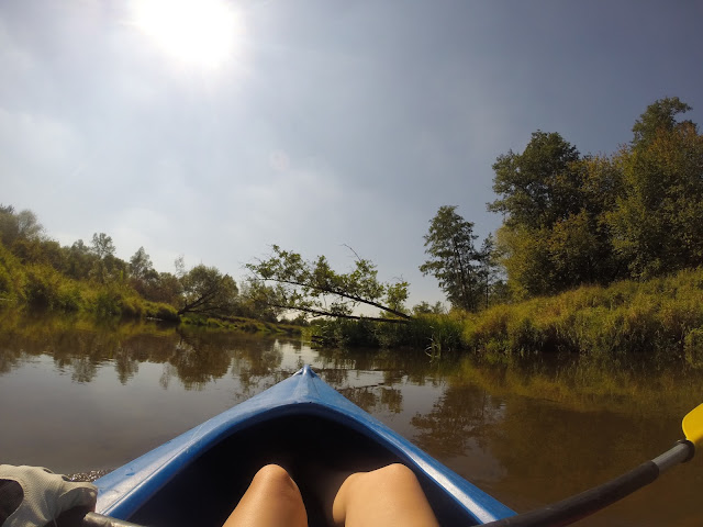 Przewidywany czas spływu to ok 5 godzin - nam udało się przepłynąć w nieco ponad 4, zaliczając kilka przerw na brzegu i masę wygłupów po drodze. Trasa nie jest bardzo wymagająca - owszem, znajdują się na niej bobrze tamy, powalone drzewa oraz mielizny, po których czasem trzeba kajak przepchnąć, ale jest tylko kilka miejsc, gdzie nurt jest bardziej bystry. Na ogół jest bezpiecznie - kiedy stan wody jest za wysoki kajaki nie są wypożyczane, jednak dla własnego bezpieczeństwa warto ubrać kapok (zwłaszcza, jeśli nie czujecie się pewnie w wodzie). Nam mimo przepłynięcia bardziej rwących miejsc udało się nie wywrócić, ale wiem, że na tej rzece wypadki się zdarzają. Warto też pamiętać, że dno rzeki jest bardzo nieprzewidywalne - często z płytkiej mielizny nagle przechodzi w zagłębienie, gdzie woda sięga np. do pach.