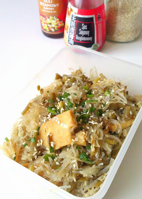 Na patelni po smażeniu tofu zeszklić cebulę, dodać czosnek, a po minucie fasolkę - podsmażać kilka minut, aż wyparuje cały płyn z fasolki. Dodać 1 łyżkę octu, 1 łyżeczkę syropu z agawy, 1 łyżeczkę imbiru, sezam, ok 4 łyżek sosu sojowego, oraz usmażone tofu. Smażyć mieszając delikatnie, ale uczciwie. Wreszcie dodać mąkę z wodą, wymieszać porządnie, ewentualnie dosmaczyć sosem sojowym lub octem.
