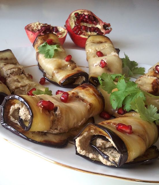 Na ostudzone plastry bakłażana nakładać łyżeczką pastę orzechową, lekko rozsmarowywać i zawijać w rulonik. Ułożone na talerzu ruloniki posypać pestkami z granatu i listkami kolendry.