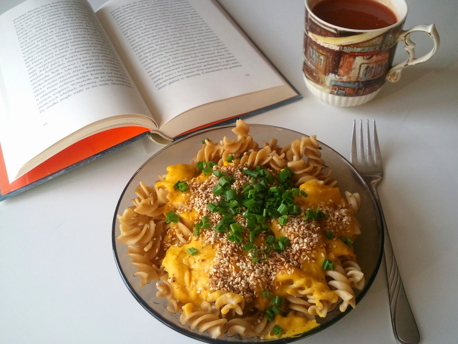 Sos z dyni do makaronuGuacamole (rozgniecione, dojrzałe awokado, pokrojone drobno pomidor, pół jabłka i cebula, sól, pieprz, posiekana natka pietruszki, oliwa) i panierowane sznycle z tofu z sezamem (panierka: po łyżce mąki pszennej, kukurydzianej i ziemniaczanej+sól, pieprz i kurkuma, sezam - rozrzedzić wodą do konsystencji śmietany - panierować - smażyć)