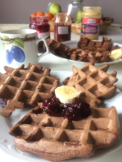 O tych gofrach pisałam już wcześniej, ale dziś przez przypadek zrobiłam nową wersję - ot, pomyliłam słoiki i zamiast mąki gryczanej, użyłam pszenną pełnoziarnistą... ;)