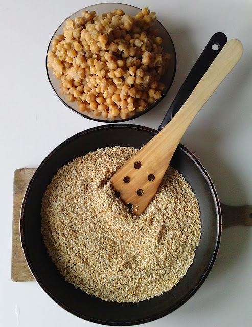 Sezam uprażyć na suchej patelni na złoty kolor stale mieszając - ziarenka łatwo się przypalają i nabierają nieprzyjemnej goryczy. Później trzeba ratować sytuacją cukrem albo jakimś syropem z agawy, ale nie jest to już TEN smak... Ja stawiam średnią patelnie (ok. 20 cm) na średnim palniku gazu i rozkręcam go do maximum. Cała operacja trwa mniej niż 5 minut, zatem naprawdę powinno się wytrzymać te parę chwil skupienia.