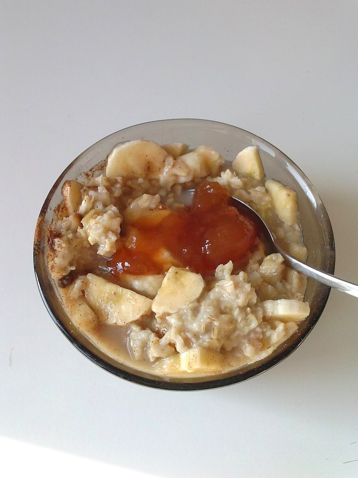 Śniadanie starszej córki: owsianka z mlekiem bananowym.