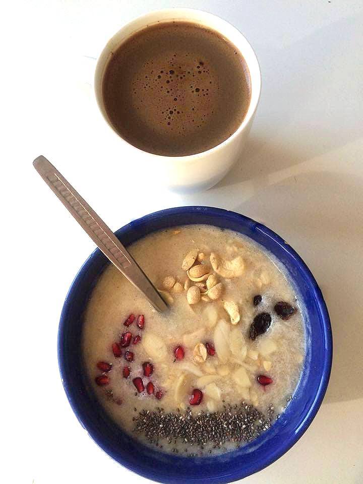 Zmiksować banan z wodą, zalać płatki owsiane, dodać dodatki. Zjeść.