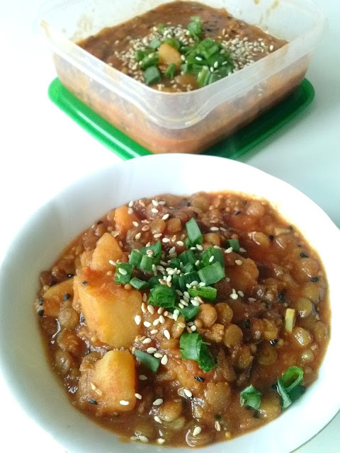 Na oleju zeszklić cebulę, dodać przyprawy i smażyć około minuty. Dodać czosnek i imbir, a po kolejnej minucie ziemniaki i soczewicę. Podsmażać przez moment mieszając, dolać wodę (tak, żeby przykryła warzywa na grubość palca), zagotować i gotować, aż ziemniaki i soczewica będą miękkie. W tym czasie można na ten przykład wziąć szybki prysznic ;) Potem już tylko dodać przecier i (ewentualnie) cukier. Pogotować jeszcze chwilkę. Podawać posypane sezamem i szczypiorem z dymki.
