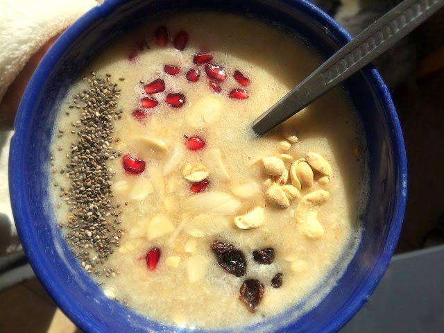 Zmiksować banan z wodą, zalać płatki owsiane, dodać dodatki. Zjeść.