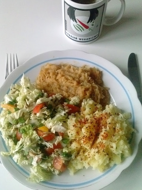 No i bardzo po polsku - groch z kapustą. Do tego ziemniaki oprószone mielonymi, suszonymi pomidorami z czarnuszką i czosnkiem oraz sałatka z winegretem.
