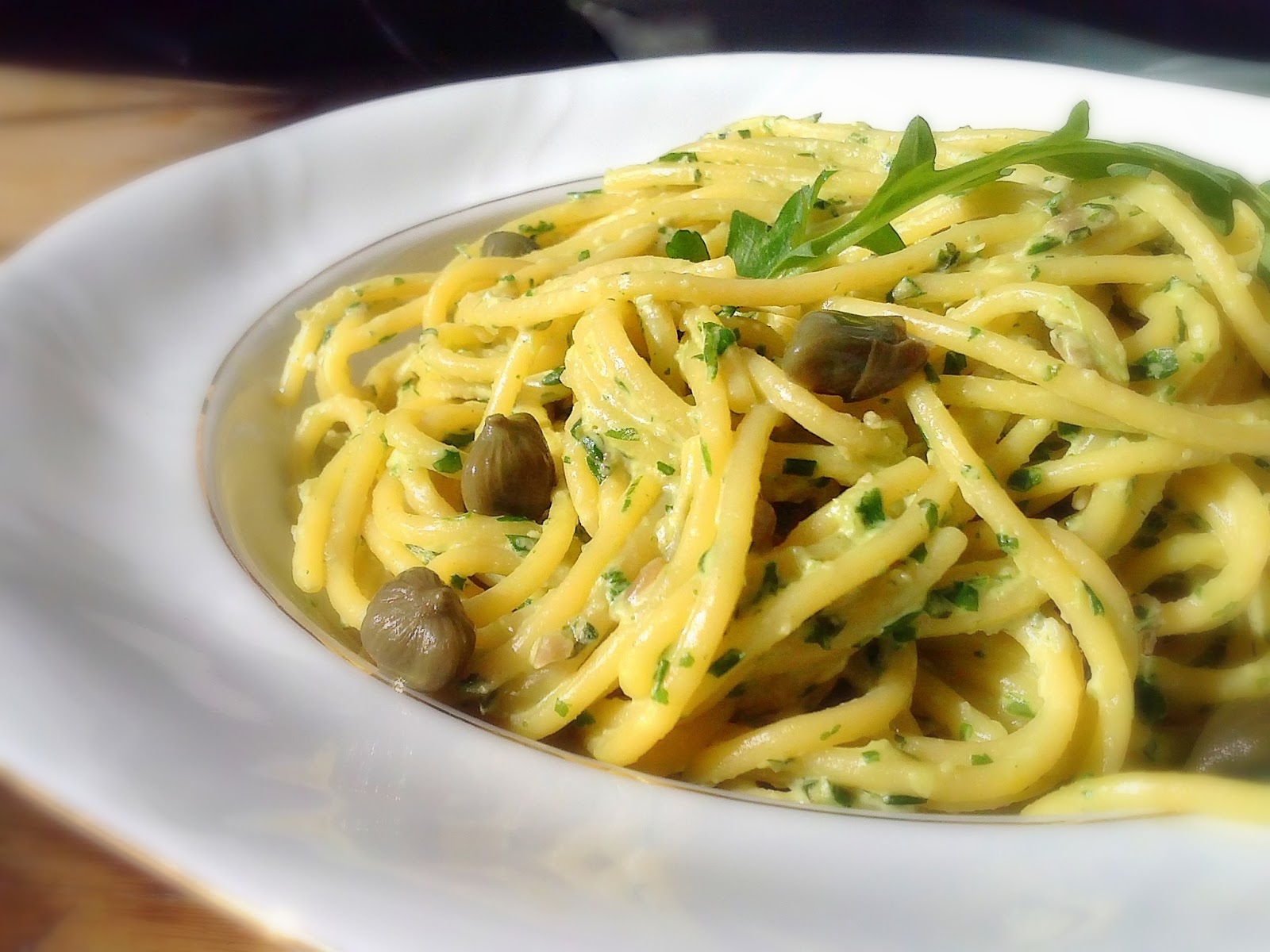 Ugotowany makaron połączyć w wyższym naczyniu z sosem, przełożyć na talerz i posypać kaparami.