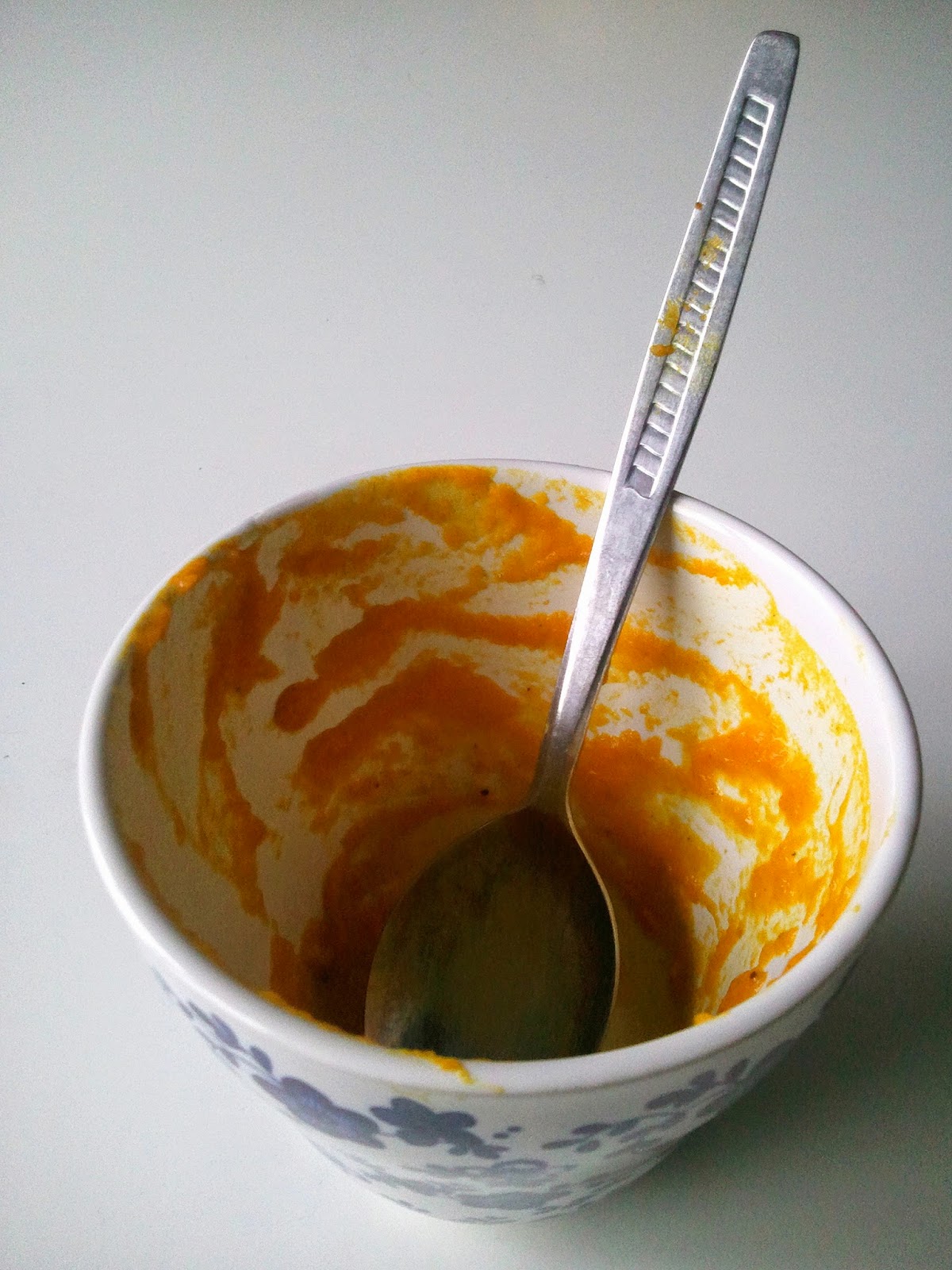 Zupa: 1,5 - 2 kg marchewek ugotować w wodzie aż będą miękkie. W tym czasie na oleju podsmażyć 2 cebule, dodać utarty imbir, cynamon i kurkumę, oraz sól i pieprz. Dodać do ugotowanej marchewki (wody nie odcedzać!) i gotować jeszcze chwilę. Zmiksować na gładką masę. Ewentualnie dodać sól. Można rozrzedzić wrzątkiem lub np. mlekiem kokosowym (ja użyłam wrzątek)