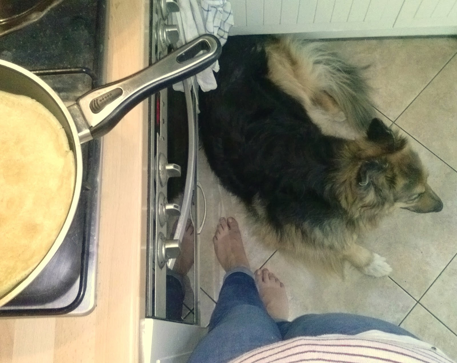 Naleśniki smażyć (choć niekiedy jest to trudne, gdy jest burza, a pies boi się hałaśliwych grzmotów...) na teflonowej patelni z rozgrzaną łyżeczką oleju.*