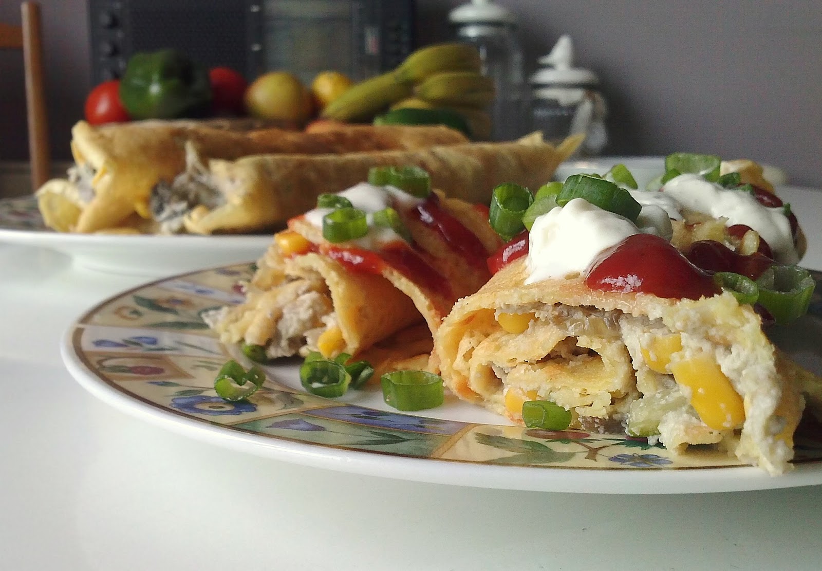 Na usmażony naleśnik nakładać farsz, zwijać w rulonik i podawać - na przykład z ketchupem, sosem czosnkowym z sojonezu i szczypiorem z dymki.
