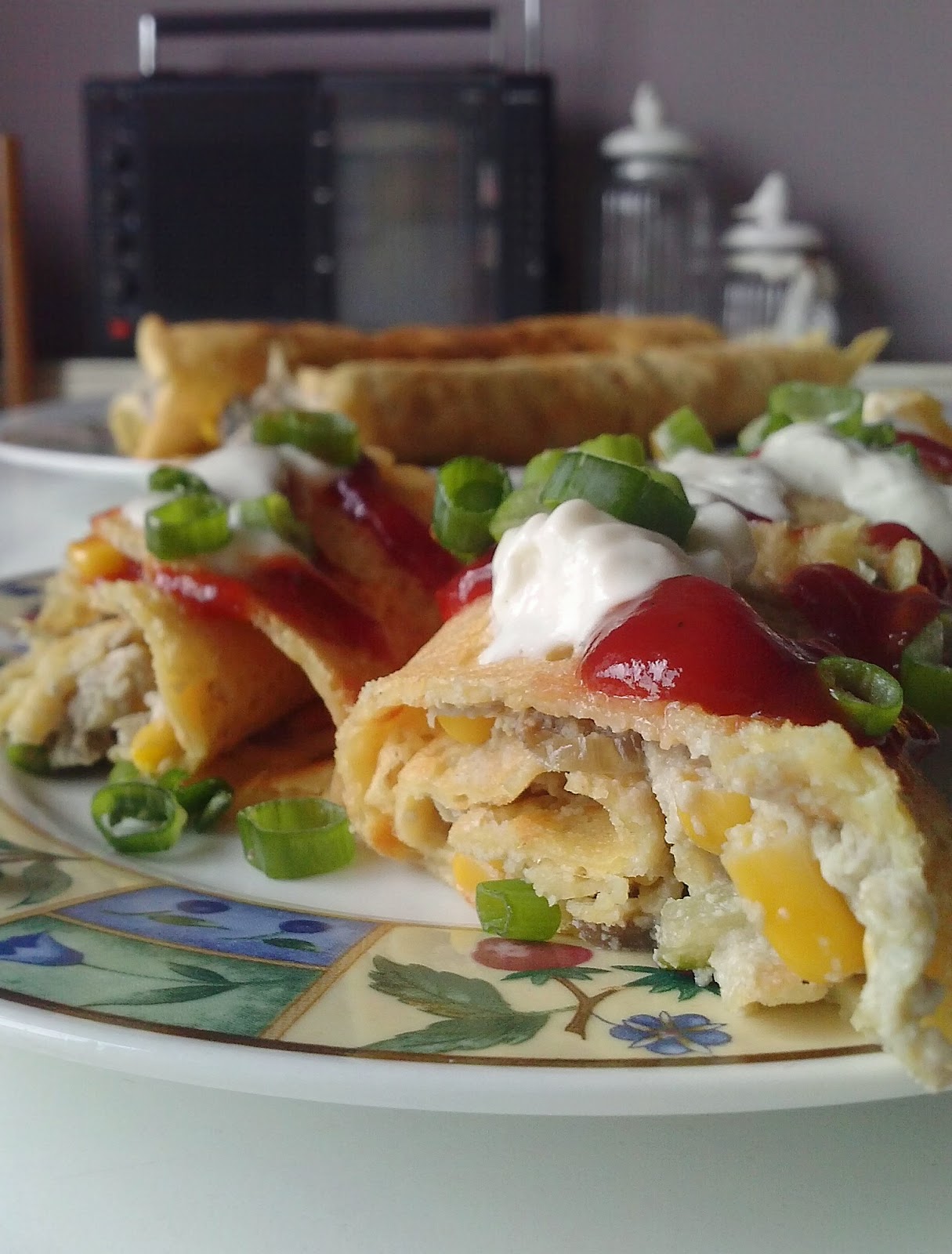 Na usmażony naleśnik nakładać farsz, zwijać w rulonik i podawać - na przykład z ketchupem, sosem czosnkowym z sojonezu i szczypiorem z dymki.