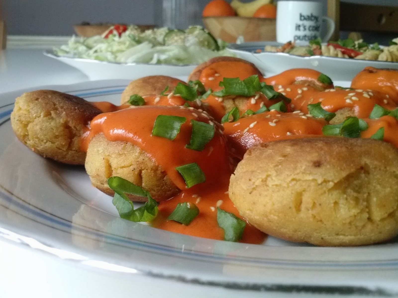 Tofu zakwasić octem, dodać cebulę i zmiksować "żyrafą" na gładką masę. Dodać mąkę, sól i przyprawy i wyrabiać coś w rodzaju ciasta - masa ta konsystencją podczas łączenia się składników przypomina kruche ciasto. Ostateczna wersja ma być dosyć gęsta, ale miękka.