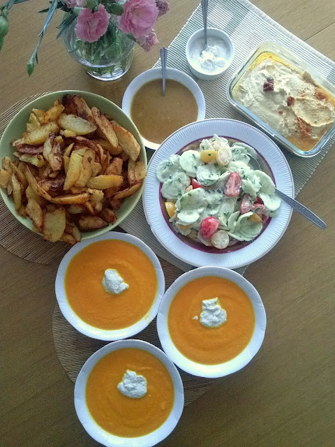 Dziś była imbirowa zupa krem z marchewek ze śmietaną słonecznikową, pieczone ziemniaki z sosami i hummusem, oraz sałatka (prawie) ze śmietaną.