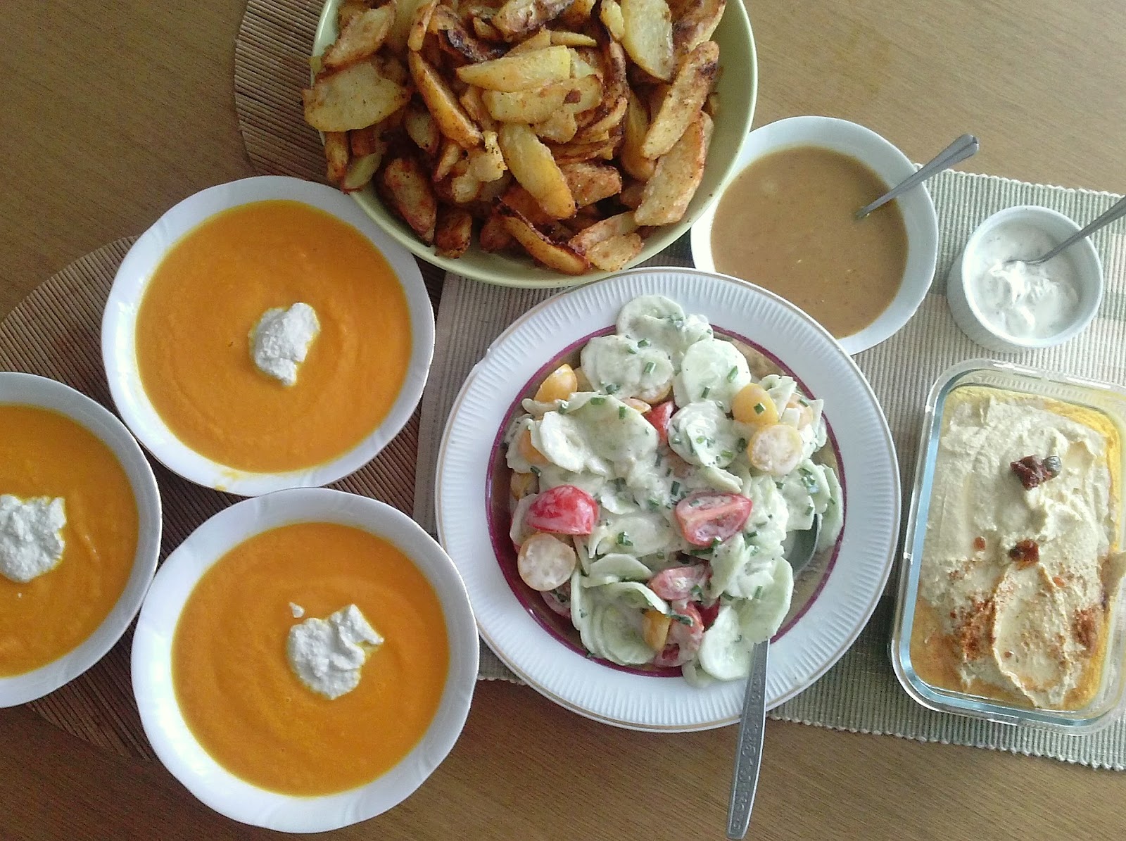 Dziś była imbirowa zupa krem z marchewek ze śmietaną słonecznikową, pieczone ziemniaki z sosami i hummusem, oraz sałatka (prawie) ze śmietaną.