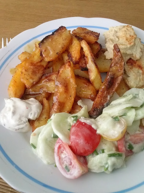 Dziś była imbirowa zupa krem z marchewek ze śmietaną słonecznikową, pieczone ziemniaki z sosami i hummusem, oraz sałatka (prawie) ze śmietaną.