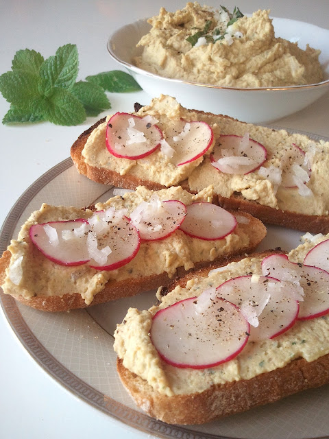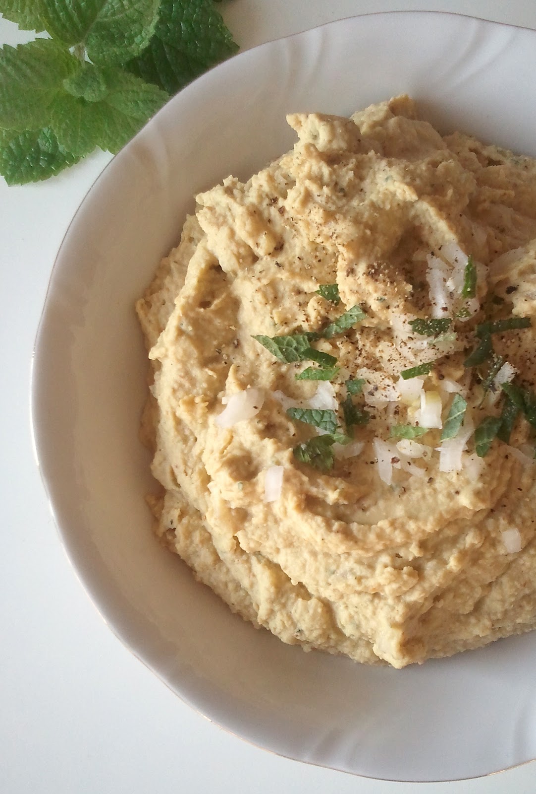 Sezam zmiksować na piaseczek z dodatkiem soli, dodać groszek, miętę, sok z cytryny, olej i miksować na gładką masę. W trakcie miksowania dolać powoli wodę. Po wyłączeniu maszyny domieszać cebulkę.