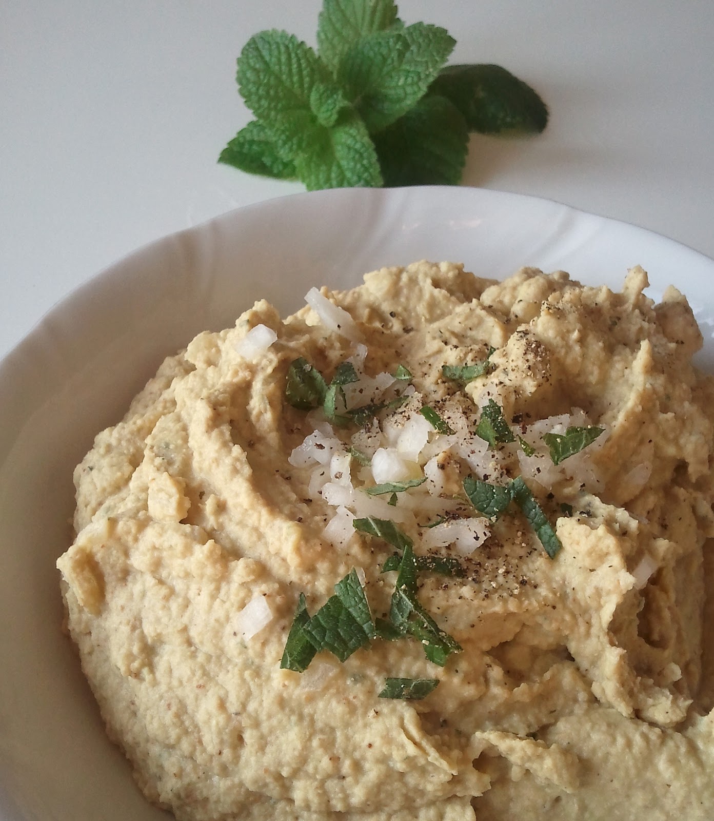 Sezam zmiksować na piaseczek z dodatkiem soli, dodać groszek, miętę, sok z cytryny, olej i miksować na gładką masę. W trakcie miksowania dolać powoli wodę. Po wyłączeniu maszyny domieszać cebulkę.