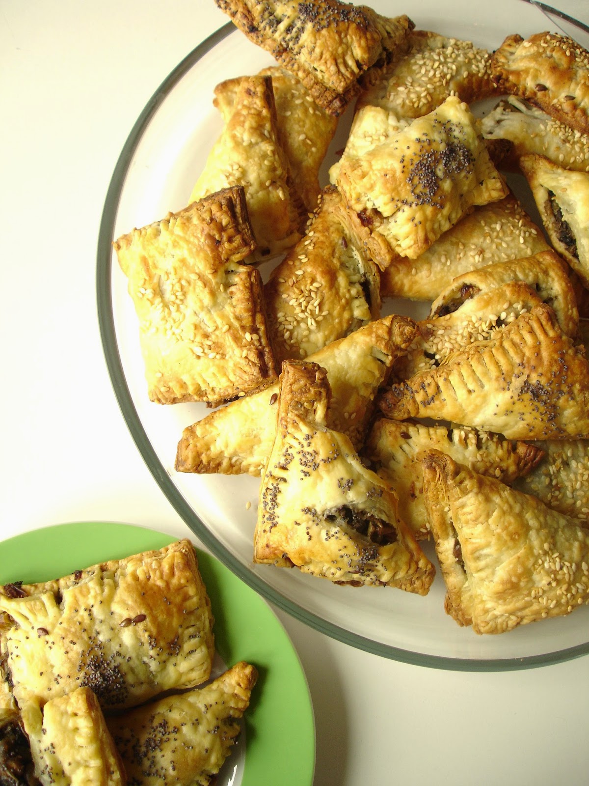 niedzielnym pokazie gotowania zostało mi sporo cebuli i soczewicy, oraz trochę pieczarek. Szkoda było to zmarnować. W lodówce łypały na mnie dwa opakowania ciasta francuskiego. Tyle dobra - paszteciki okazały się idealnym rozwiązaniem.