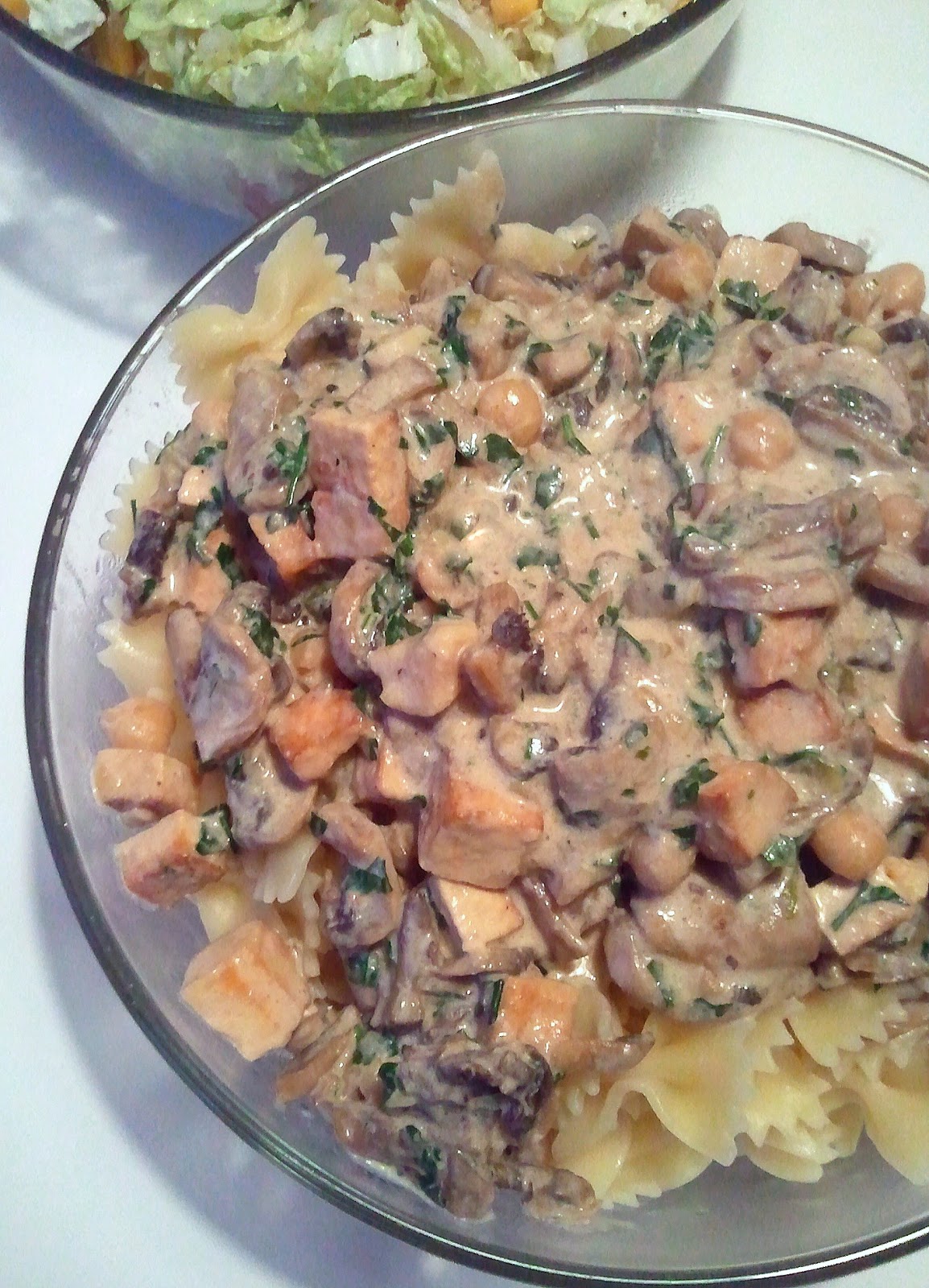 Szybki w przygotowaniu sos pieczarkowy z kwaśną śmietaną sojową, tofu, ciecierzycą oraz natką pietruszki.
