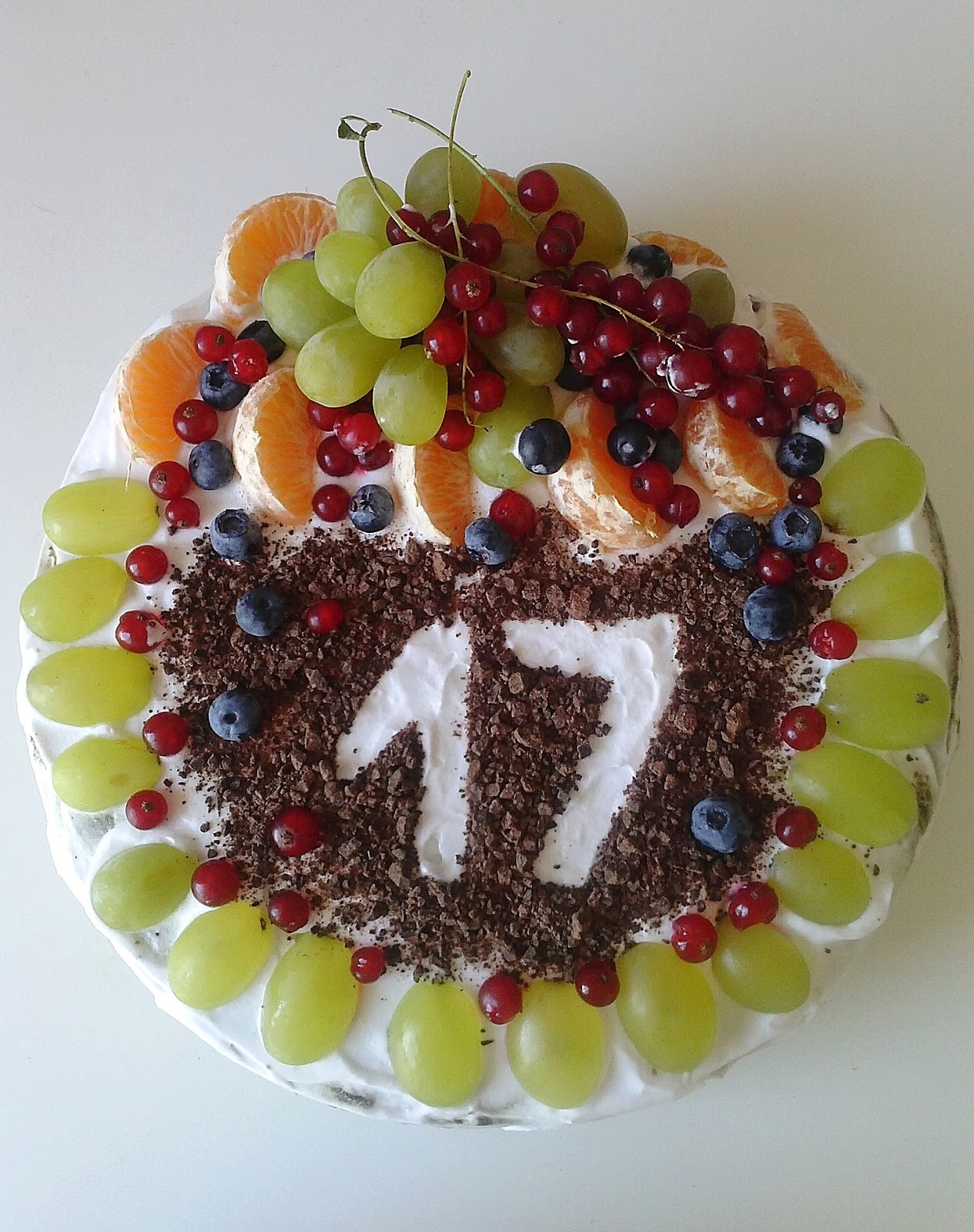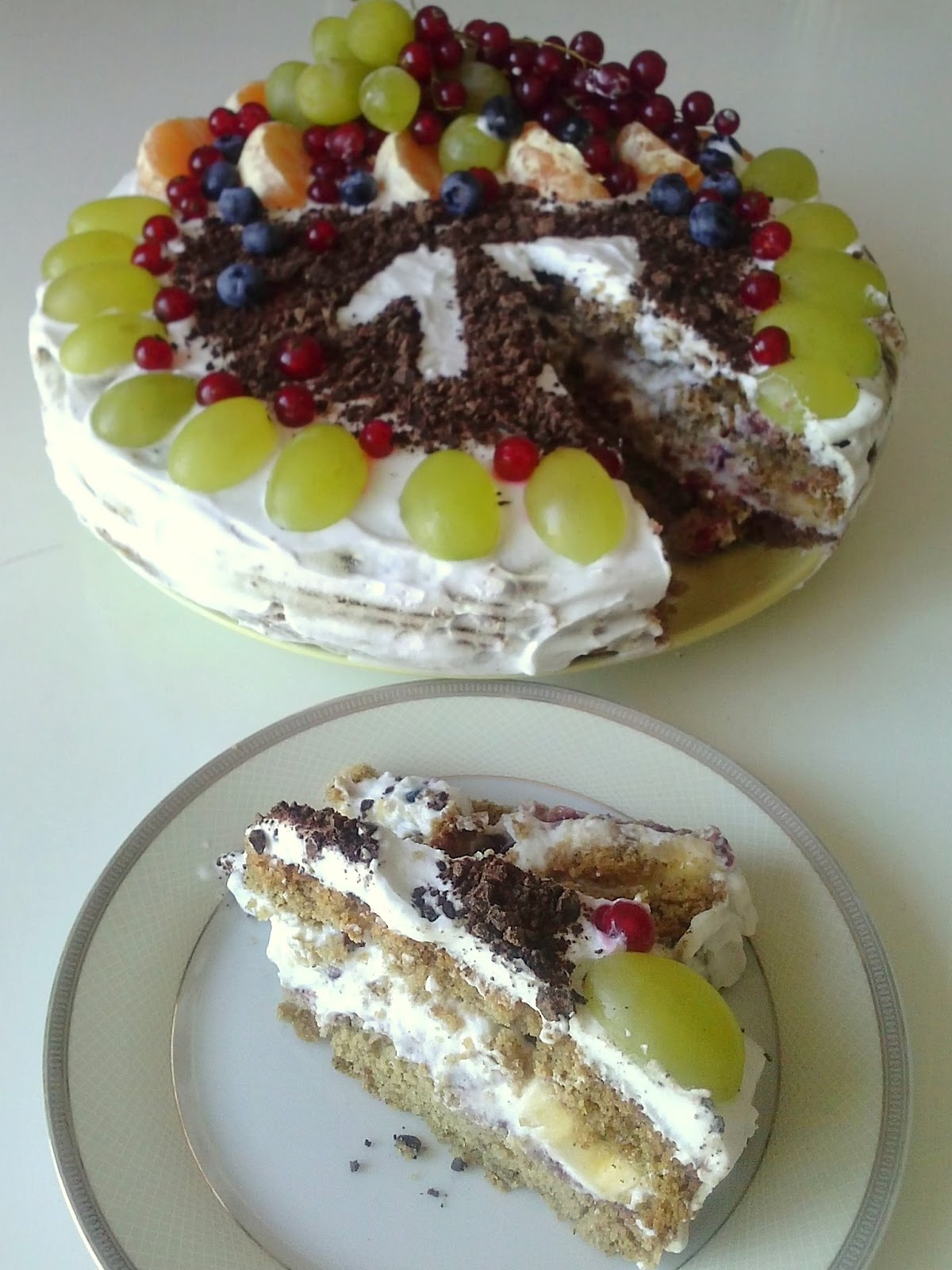 Jestem człowiekiem pospiesznym z wiecznym deficytem czasu, zatem moje torty wychodzą trochę podobnie jak te Małgorzaty Musierowicz z "Całusków pani Darling" - zawsze im czegoś zabraknie, a to śmietany na boki (bo kupiłam za mało śmietan-fixów), a to ciasto nie do końca prosto się przekroi i efekt końcowy troszkę przypomina krzywą wieżę w znanym włoskim mieście na Pe. No różnie... Choć jednak hałda owoców maskuje nieco przekrzywiony horyzont - pełna profeska! (fajnie mieć urodziny latem ;)