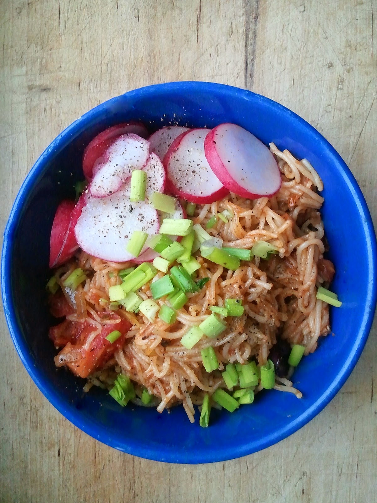 Dzisiejsza, poranna improwizacja. Słodka owsianka mnie nie nasyciła. W lodówce było trochę makaronu, cebula, pomidor i jeszcze parę innych rzeczy. Wymyśliłam to: