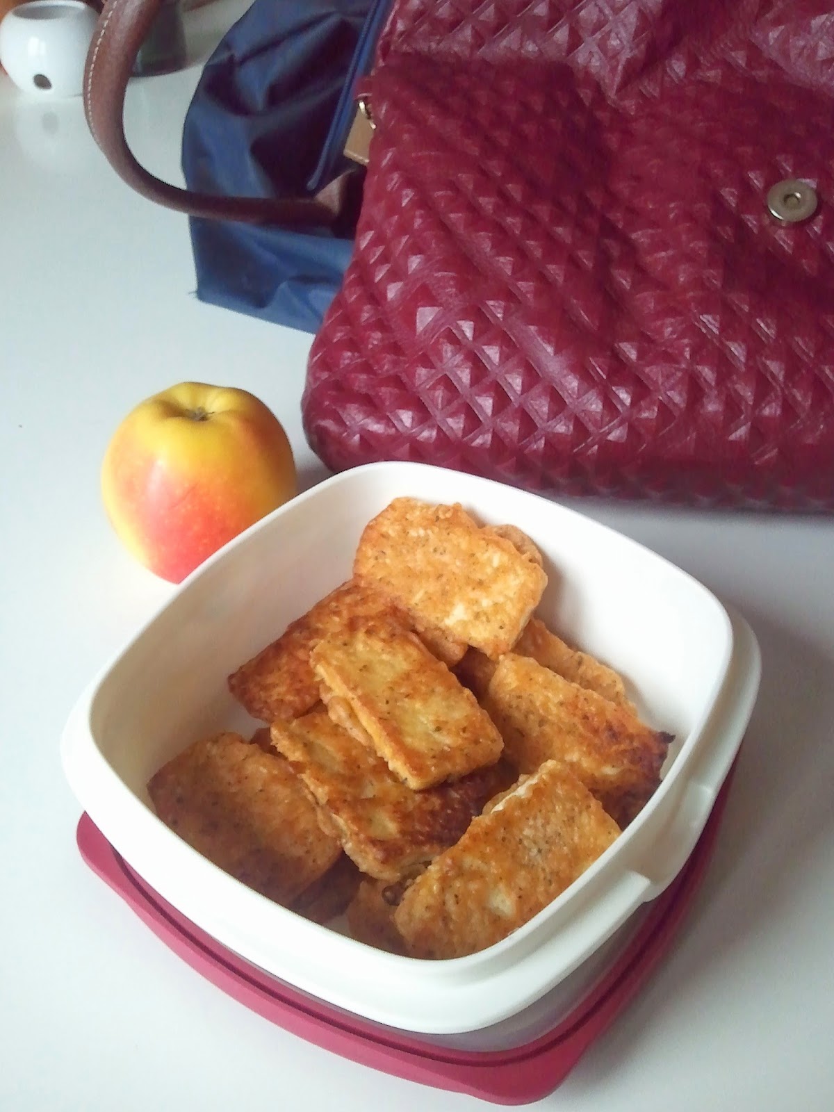 Kolejny z szybkich obiadów do pracy - sznycle. Sznycle są z tofu, które zalegało w lodówce i łypało na mnie za każdym razem, gdy tam zaglądałam. Z kostki (180g) starczyło dwie porcje.