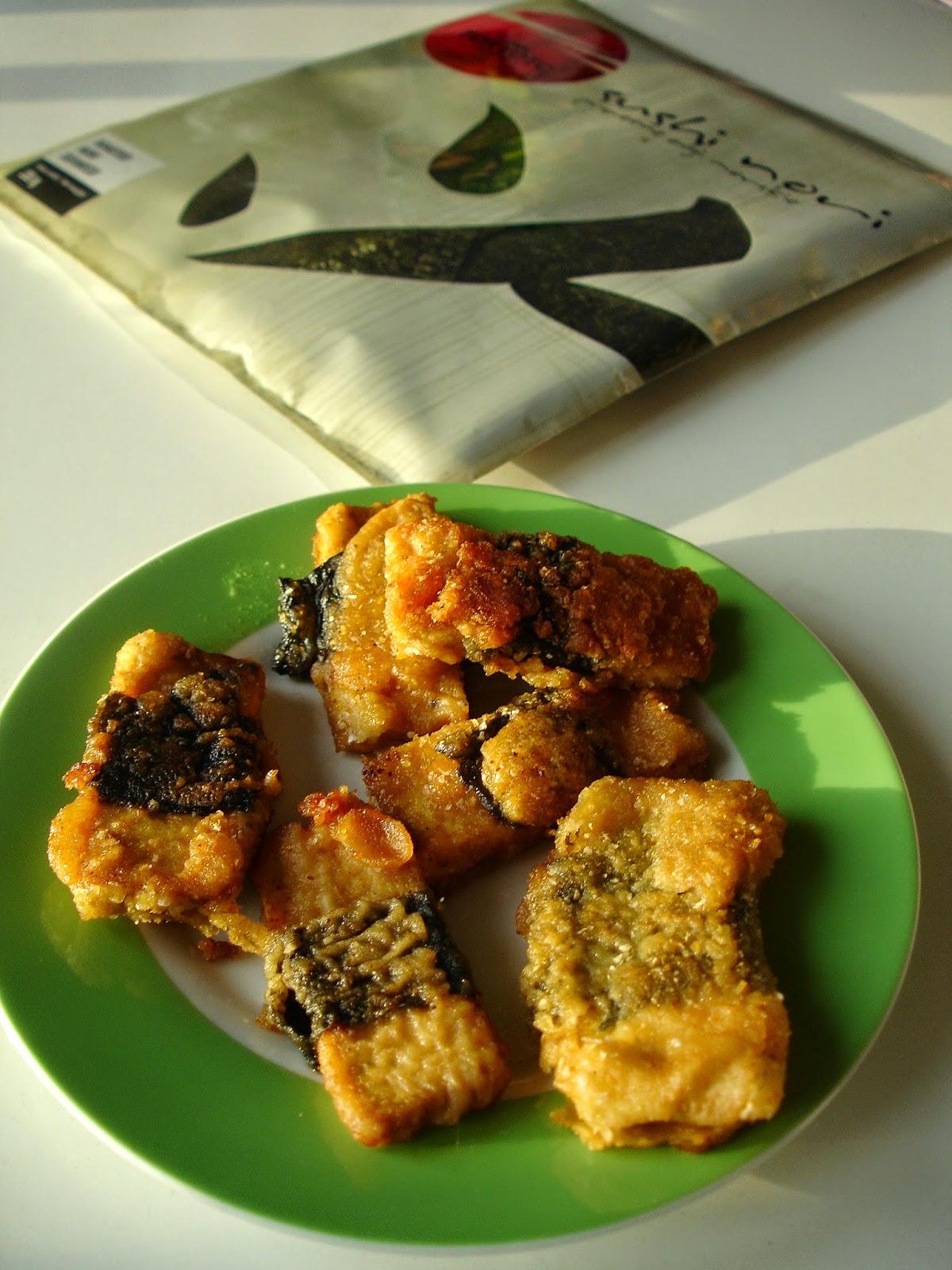 Tofu polać obficie sosem sojowym, zawijać w paseczki nori, maczać w cieście i smażyć na nieco większej ilości oleju do zrumienienia.