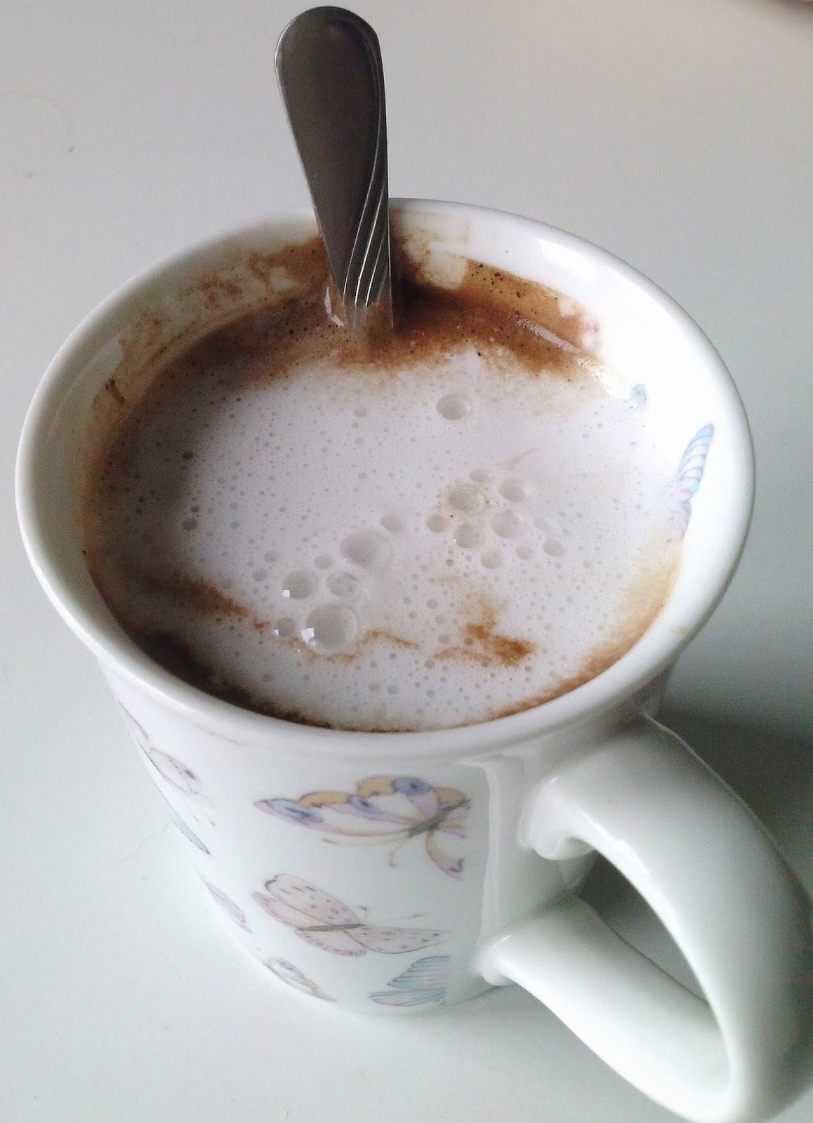 Poniżej kawa ze spienionym mlekiem kokosowym autorstwa starszej córy.