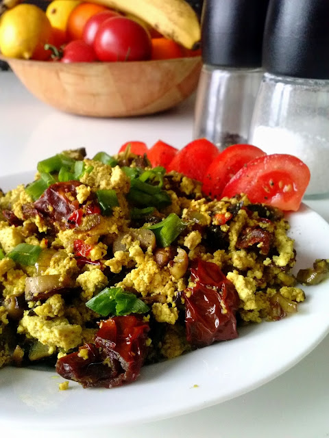 Pokrojoną cebulę zeszklić na oleju, dodać czosnek, a po minucie pokrojone suszone pimidory i pieczarki - posolić i smażyć na średnim ogniu stale mieszając. Gdy pieczarki przestaną być surowe, dodać rozgniecione widelcem tofu, kurkumę, sól oraz sól kala namak i smażyć jeszcze chwilę również mieszając.