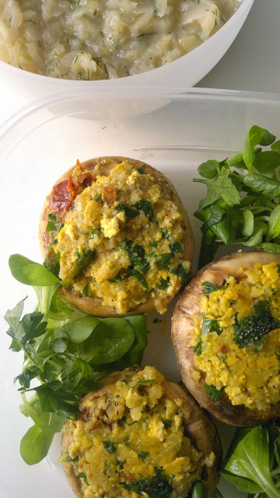 Faszerowane pieczarki:Część tofucznicy wymieszać widelcem (rozgniatając i ucierając) z kuskusem i natką. Można ewentualnie doprawić nieco solą i pieprzem.