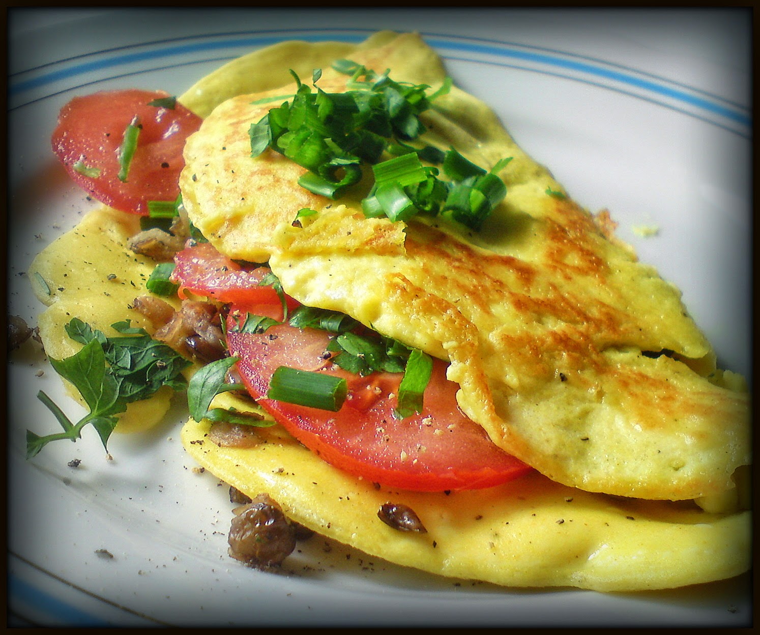 Drugi omlet wypełniony był soczewicą podsmażaną z cebulą i cynamonem (dokładniejszy przepis podam niebawem) + pomidor, szczypior, natka, sól&pieprz.
