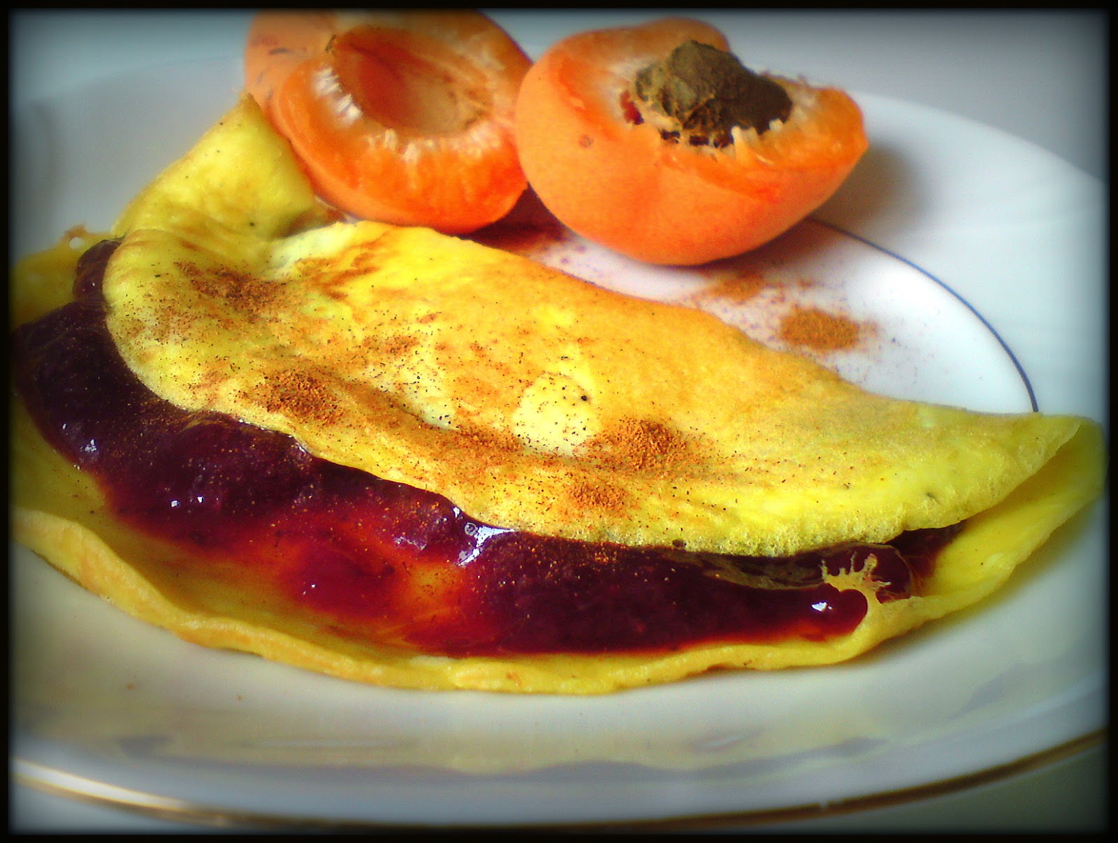 Trzeci omlet to już klasyka - w środku dżem własnej roboty (z polskich truskawek ;) i cynamon + morela (również lokalna - sezon przecież...)