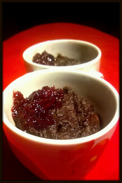 pochodzi z bloga erVegan.Ilu kucharzy, tyle wersji dania. Moje modyfikacje wynikły z konieczności. Pierwszą wersję zrobiłam z mąki pszennej 650. Ciasto wyszło bardzo smaczne, ale po upieczeniu niezwykle zbite i gęste. A spodziewałam się puszystości i lekkości. Kolejna próba była zatem z użyciem mąki gryczanej (erVegan użył pełnoziarnistej, a to była jedyna wersja mąki z pełnego ziarna, jaką posiadałam) i dosłownie odrobinki (na czubek uchwytu łyżeczki) proszku do pieczenia. Mleka też nieco więcej. Końcowy efekt wyszedł zachwycający. Dżem wiśniowy wieńczy dzieło.