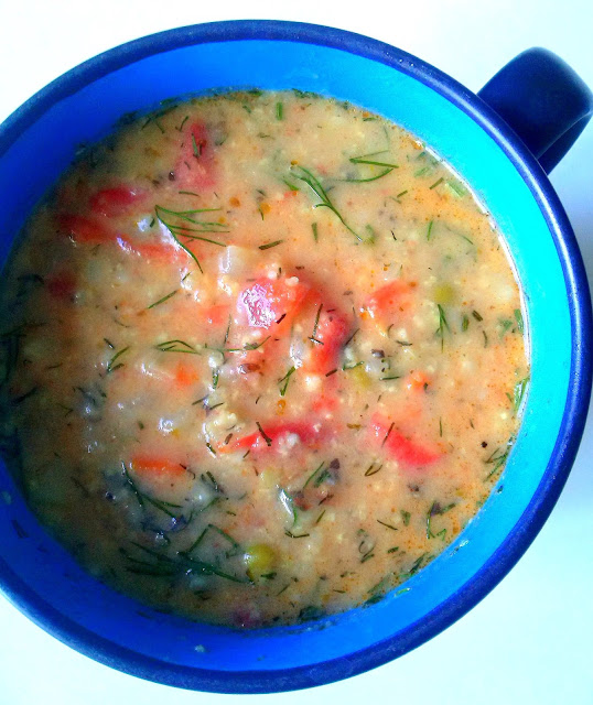 Krupnik to taka zwyczajna zupa z kaszą. Ale przecież nigdzie nie jest napisane, że tylko z jęczmienną. Dziś wsypałam kaszę jaglaną. No i warzywa - dlaczego tylko zwykła włoszczyzna? A groszek? A Kalafior? A Pomidory...? Zaszalejmy nieco kulinarnie... ;)
