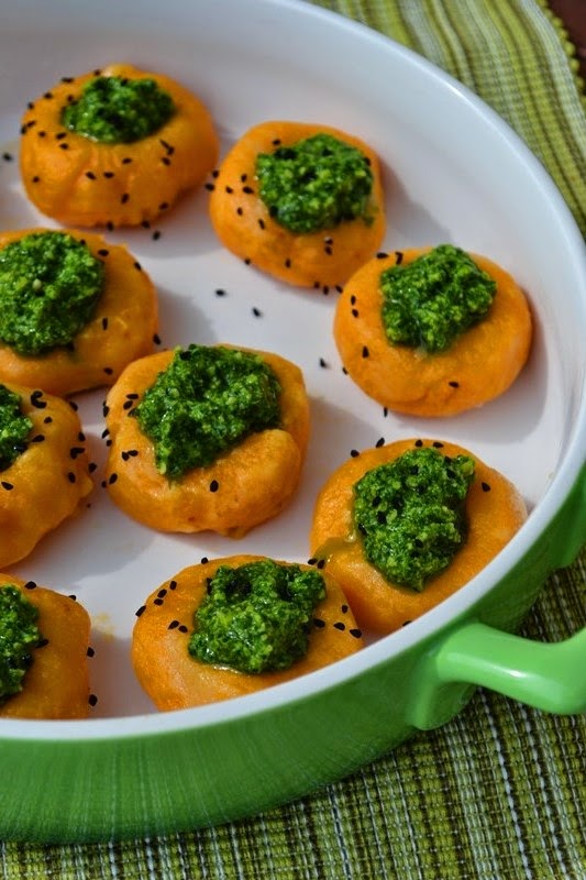 - w zagłębienia klusek wkładamy pesto