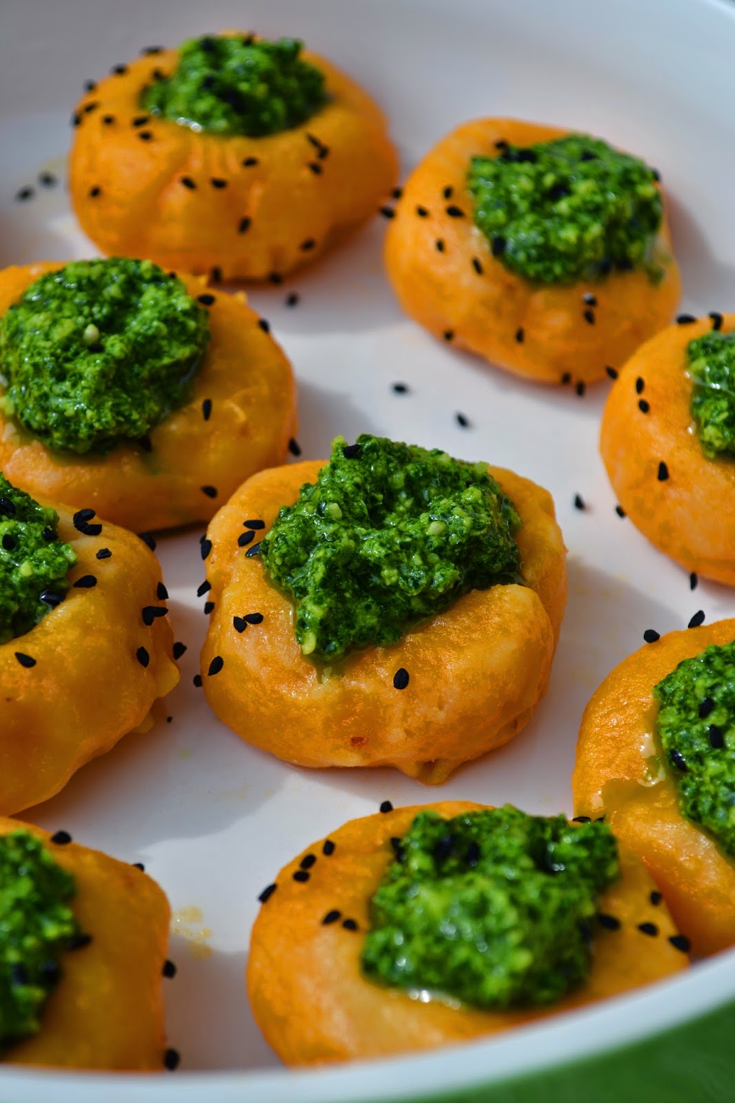 Kluski są delikatne i lekko słodkie co w towarzystwie słonego i cytrusowego pesto z jarmużu nadaje im charakteru. Kolor klusek jest niesamowity i kontrastuje z zielenią pesto.